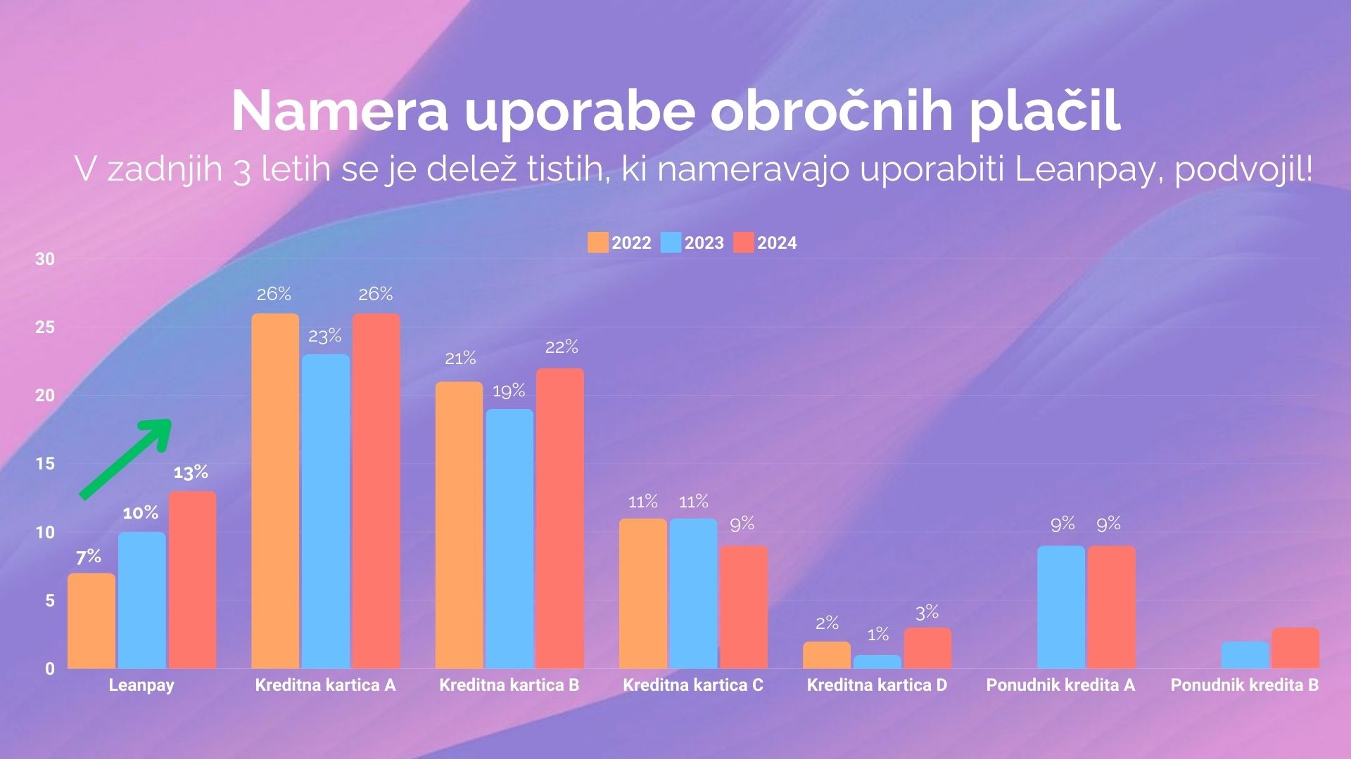 Ta metrika je v enem letu zrasla iz 10 % na 13 %. Tako rezultati potrjujejo, da vse več ljudi namerava izbrati Leanpay, kot svojega želenega ponudnika plačil na obroke za nakupe.
