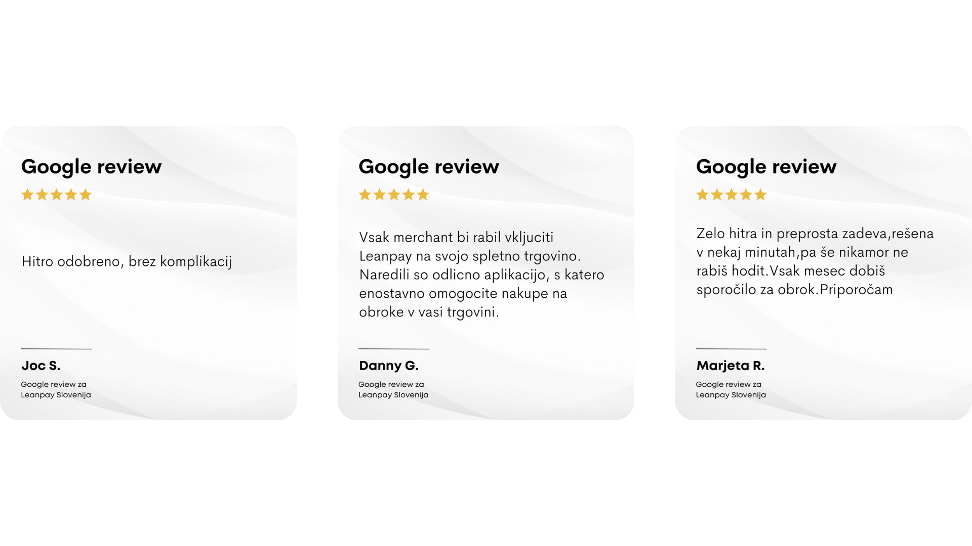 Naši uporabniki radi poudarijo, kako preprost in hiter je nakup na obroke z Leanpay. Brez nepotrebnih papirjev, brez čakanja in z možnostjo prilagajanja obrokov po svojih željah. Preveri, kaj pravijo spodaj.
