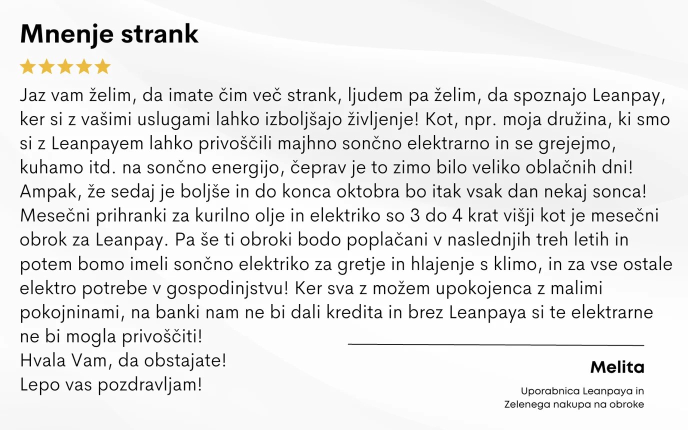 Ob upoštevanju vseh teh faktorjev smo pri Leanpayu oblikovali nov produkt - Zeleni nakup na obroke. Ta inovativna rešitev ti omogoča, da enostavno in dostopno financirate nakup energetsko učinkovite opreme in tehnologij za obnovljive vire energije. S tem si zagotovite večjo finančno varnost in hkrati pozitivno prispevate k trajnosti okolja.
